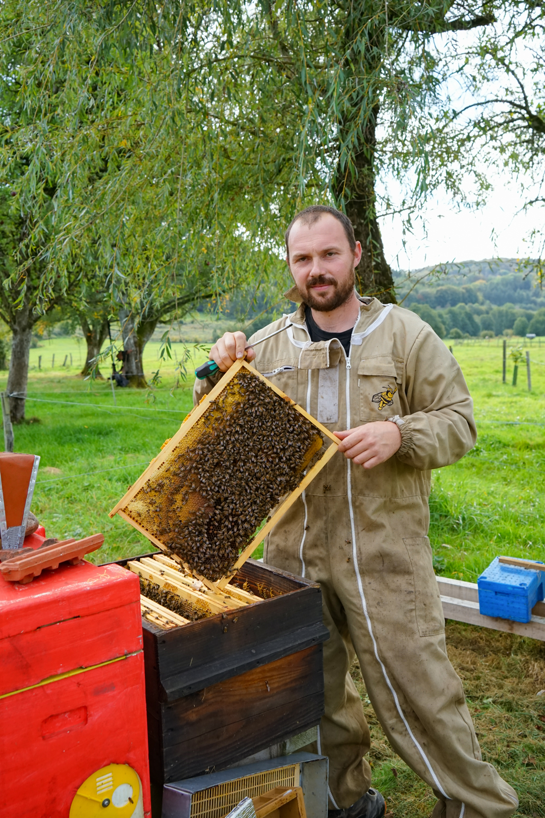 Cela fait 10 ans que je suis apiculteur, installé en tant que professionnel depuis septembre 2022. J’ai été paysagiste pendant 15 ans puis j’ai démissionné et j’ai repris mes études à Vesoul. J’y ai préparé un Brevet Professionnel Responsable d’Entreprise Agricole : c’était 10 mois de formation que j’ai terminés en juin et, en septembre, j’étais installé avec la chambre d’agriculture. J’ai commencé mon projet en même temps que ma formation.